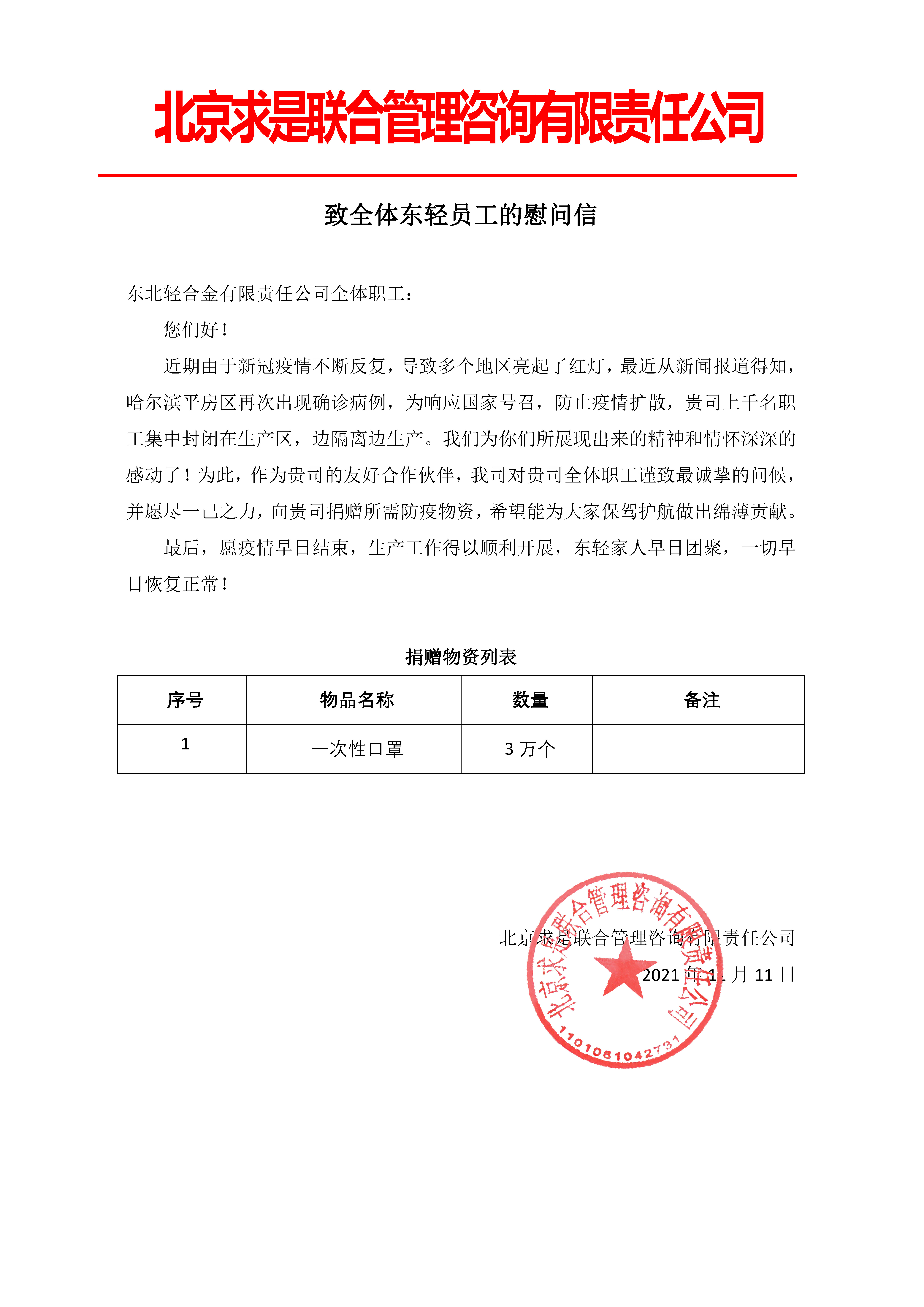 北京求是聯(lián)合管理咨詢有限責任公司作為中鋁東北輕合金有限公司的長期友好合作伙伴,在了解情況后,緊急向中鋁東北輕合金有限公司捐贈所需防疫物資,希望能為東輕的保駕護航做出綿薄之力,更期望疫情早日結束,生產(chǎn)工作得以順利開展,東輕家人早日團聚。